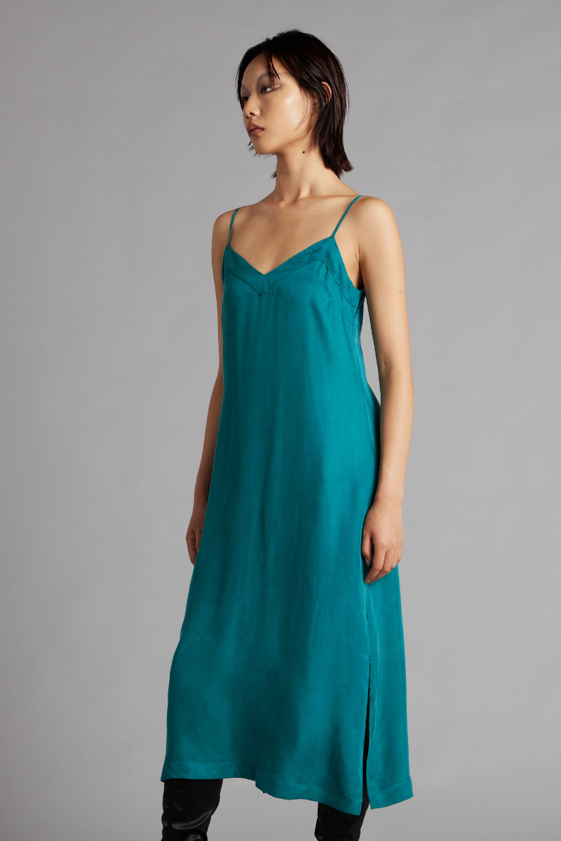 The Glider Midi Slip Dress has been refreshed this season in a stunning Jewel Green hue, adding a contemporary twist to this iconic Nique style. Designed to be a timeless wardrobe staple, the dress showcases a chic and modern silhouette.