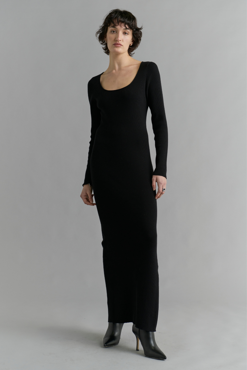 Featuring a sleek scoop neckline, long sleeves, and a maxi length, it skims the body for a flattering, streamlined silhouette. A side split adds subtle movement, balancing sophistication with a contemporary edge. Whether styled with boots for cooler days or dressed up with minimal heels, this piece transitions seamlessly from work to evening.