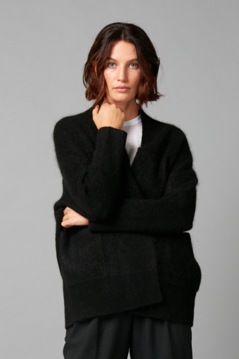 Discover the perfect balance of luxury and comfort with the Black Akine Cardigan. Spun from a luxuriously soft and warm mohair wool blend, the Cardigan promises to keep its shape and soft touch wash after wash. Featuring two front pockets for ultimate coziness, the stretchy fabric allows you to wrap yourself up and feel right up home wherever you are. An effortless addition to any minimalists wardrobe.