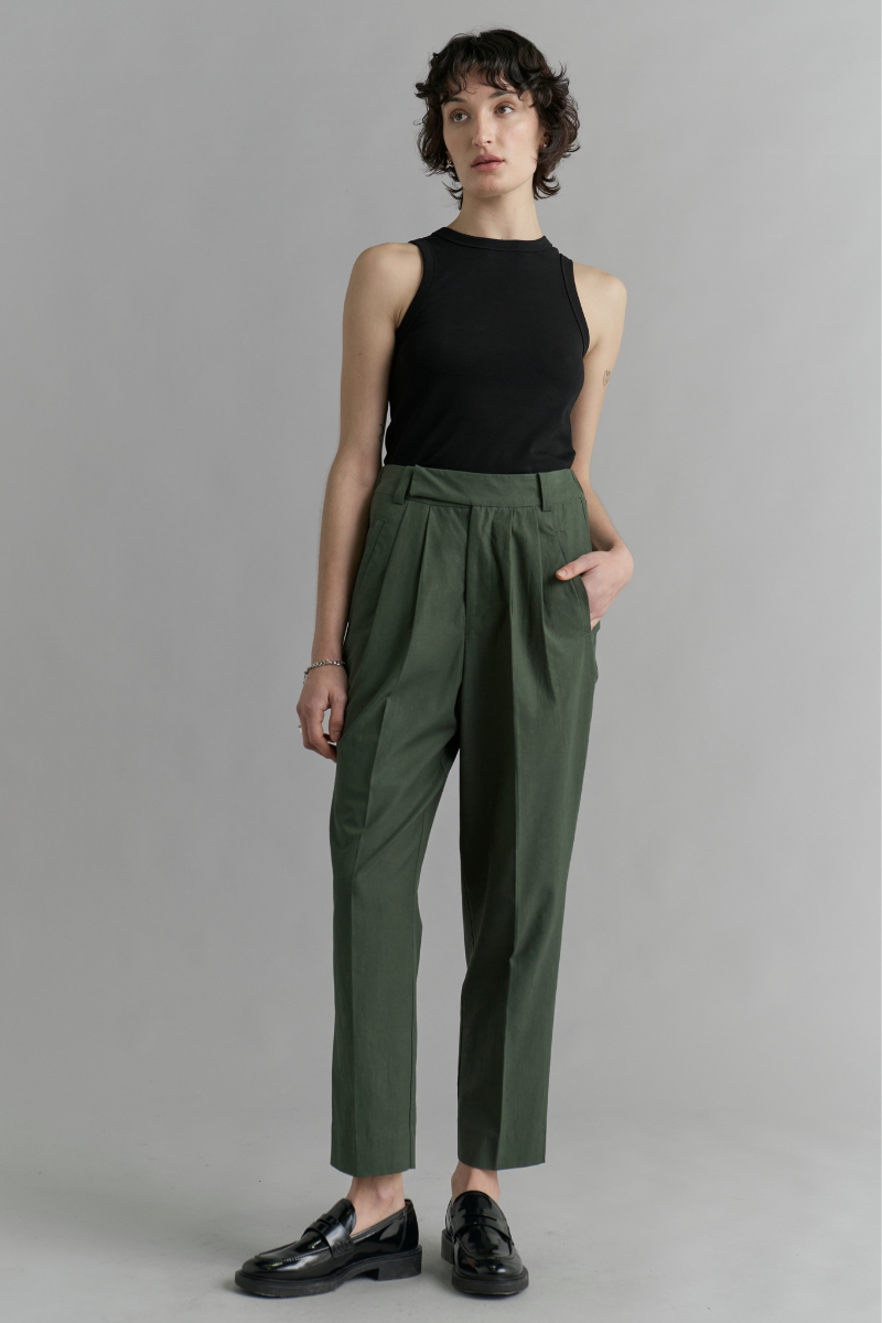 Returning this season in a stunning Forest Green, the signature Bowie Pants are inspired by the iconic style of David Bowie in the 1980s. These pants offer a modern twist on casual tailoring with a relaxed fit and genderless design, crafted to flatter every body type. The high-waisted pants feature an elasticated back waist for added comfort and an extended tab closure for a unique touch.